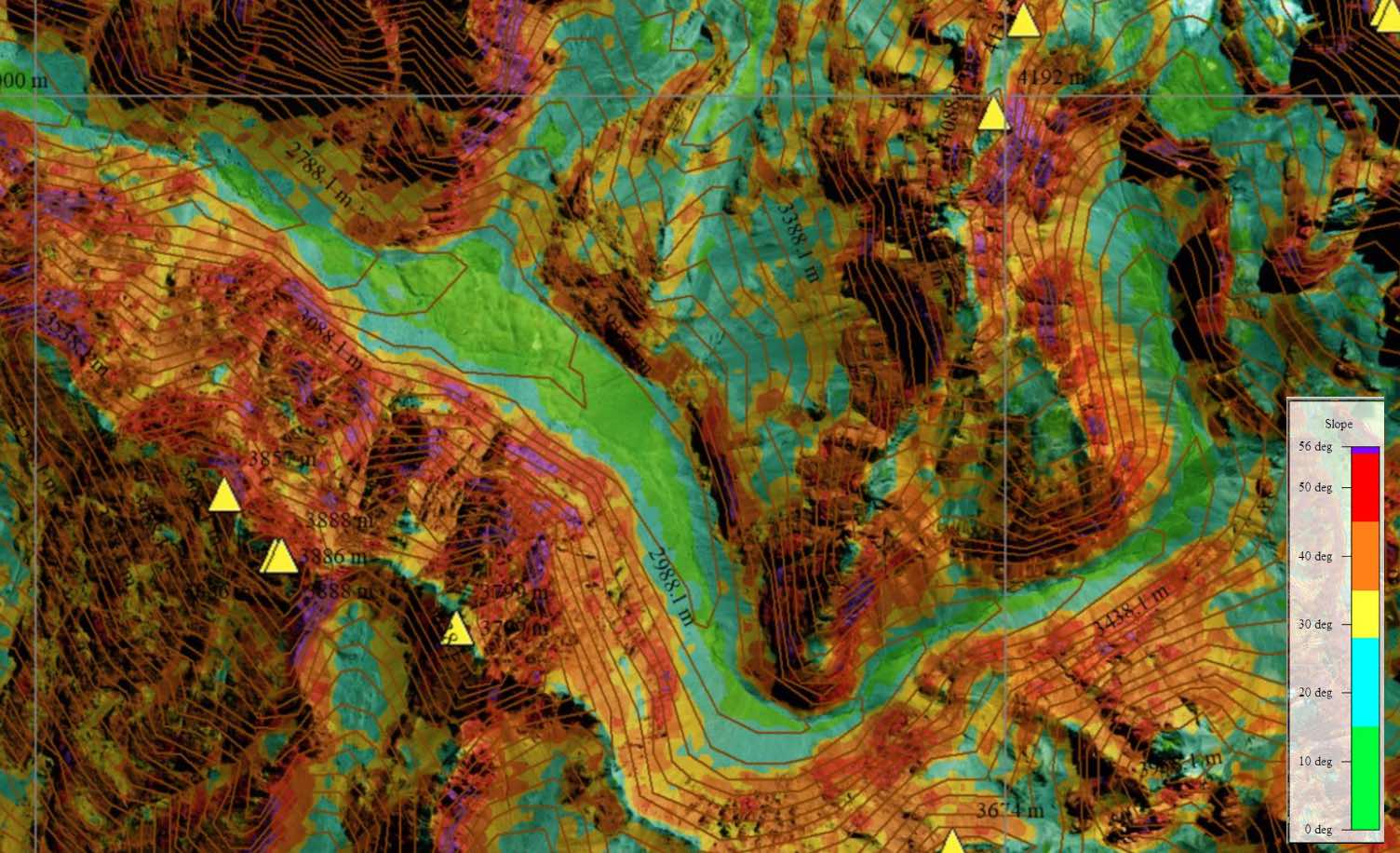 En el mapa se puede visualizar las zonas potenciales de liberación de avalanchas, las cuales oscilan entre 28º y los 45º de pendiente de ladera; podemos observar el Cajón del Río Blanco, de color verde en el fondo de valle con 10º a 15º; y las zonas de liberación se ubican en ambas laderas del Cajón.