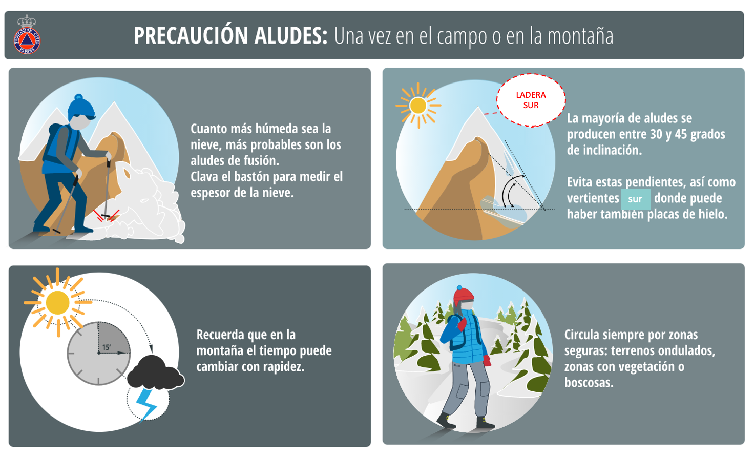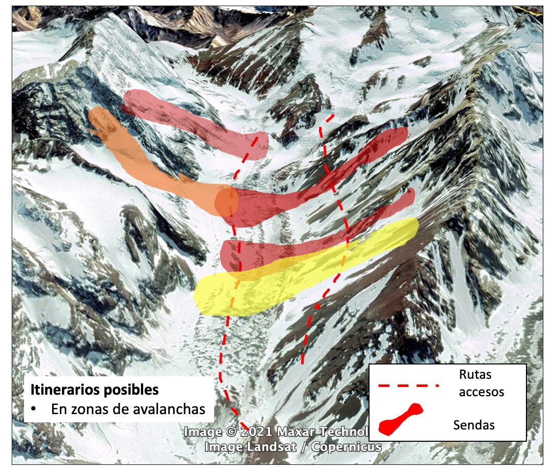 En zonas de avalanchas o aludes, debes consiederar elevar tu nivel de PRECAUCIÓN Y AUTOCUIDADO, considerando la PROTECCIÓN con el ARVA o DVA, PALA Y SONDA; además, hacer revisión de la METEOROLOGÍA, hacer la EVALUACIÓN DE ESTABILIDAD DEL MANTO DE NIEVE y considerar el Peligro de Avalanchas, nieve nueva 30-40 cm, puede haber peligro en pendientes + inclinadas, nieve nueva 50-60 cm, el peligro es generalizado.