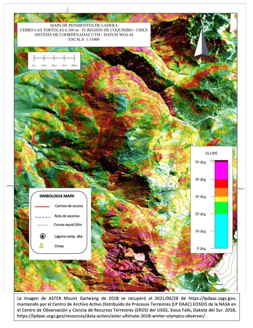 En el siguiente mapa de pendientes, se pueden vizualizar las zonas de liberación, que existen en el Cº Las Tórtolas, estas tienen un aspecto de Oeste, Suroeste y Noroeste preferentemente y rangos que van desde los 28º a los 45º de manera más recurrente; y las zonas se inicio de avalanchas se ubican en una elevación desde 4.700 m a los 6.035 m