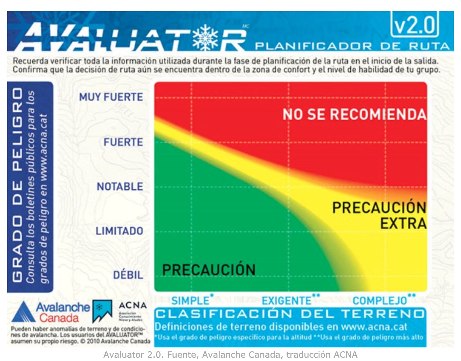 Esta herramienta utiliza una escala de colores ( rojo, amarillo y verde.) donde indica qué formación, conocimientos y experiencia necesitamos para realizar las actividades en una condiciones seguras. En las zonas de transición entre los diferentes niveles de color, cada uno debe escoger qué nivel de riesgo quiere asumir. Por tanto, el Avaluator da unas recomendaciones según la zona escogida.