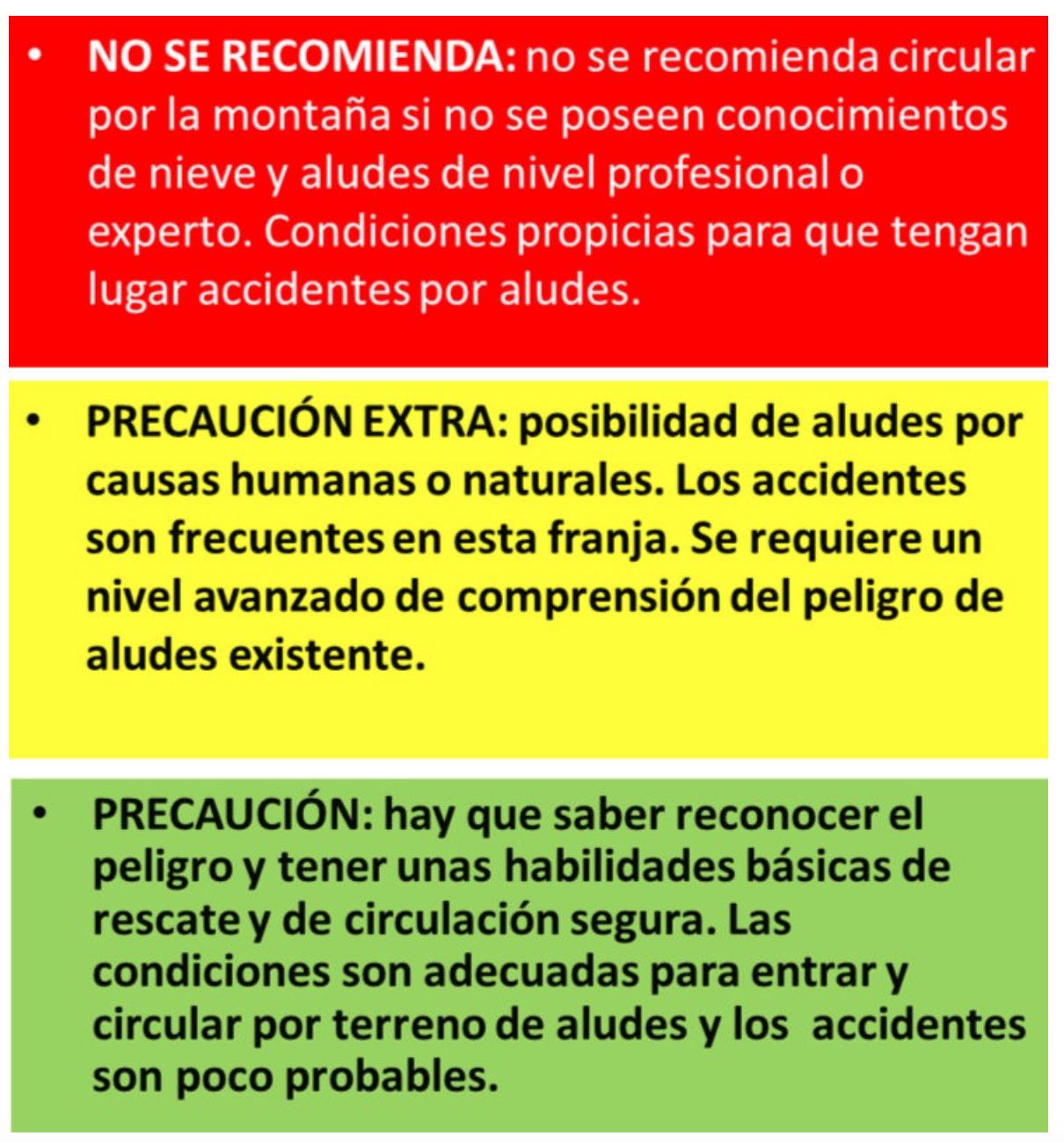 NO SE RECOMIENDA - zona roja del evaluador: no se recomienda circular por la montaña en la zona de color rojo sin conocimientos de nivel profesional o experto en nieve y aludes. Condiciones preparadas para que haya accidentes por aludes.