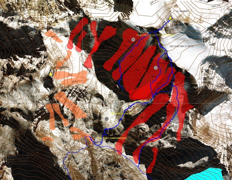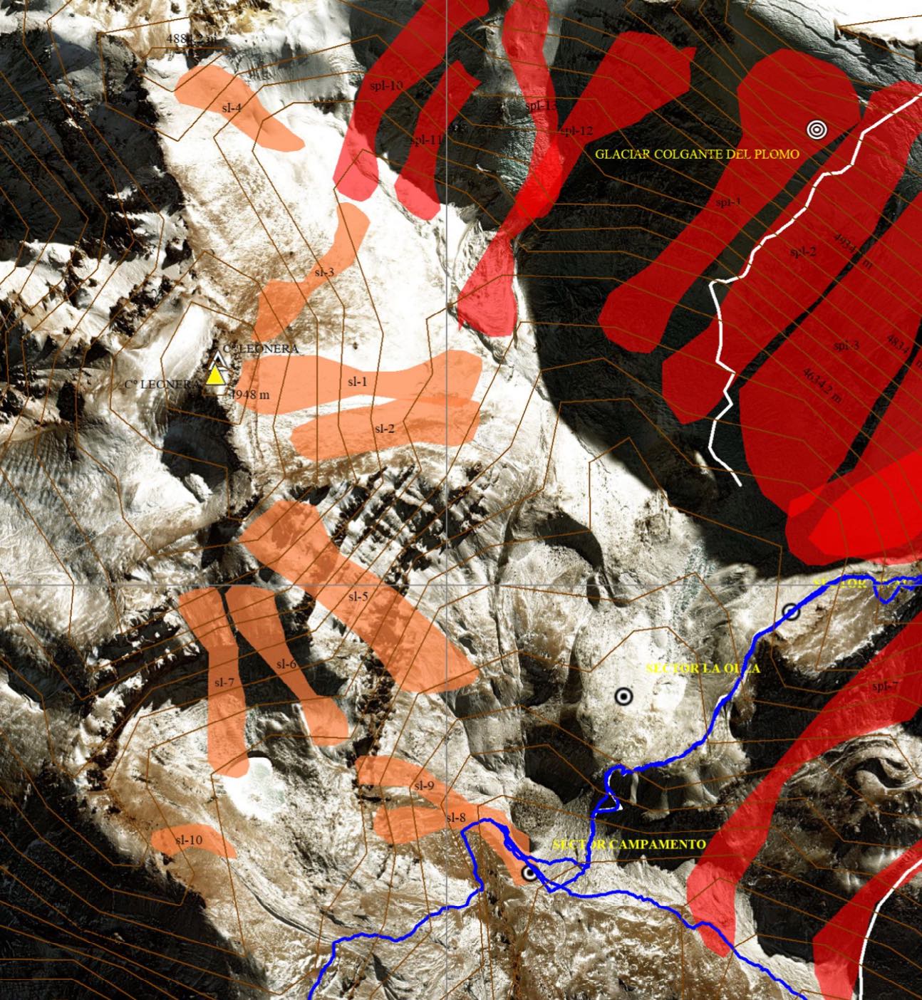 En la ruta normal del Leonera, no se ubican avalanchas, la cual va por vía del sector de "Cancha de Carrera", es decir, las sendas identificadas en el Leonera, se ubican en la cara "Este y Sureste" del Leonera, dichas sendas afectan la ruta de descenso del Leonera hacia la Olla del Plomo, y debemos tener especial cuidado, con la ubicación del Campamento, en el sector del Refugio, previo a subir hacia sector La Olla; ver el siguiente mapa, como las sendas en color naranja podrían afectar el Campamento, debajo de la Olla.