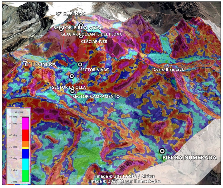 La imagen de la izquierda ( 2 ), en modelo 3D muestra las pendientes o zonas de inicio, que van entre los 28º de pendiente de ladera a los 50º de pendiente, en colores amarillo, naranja, rojo y fucsia. El modelo digital muestra los Cerros El Plomo, Leonera y Bismarck.