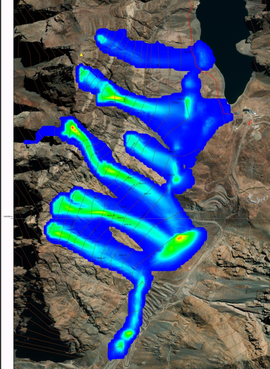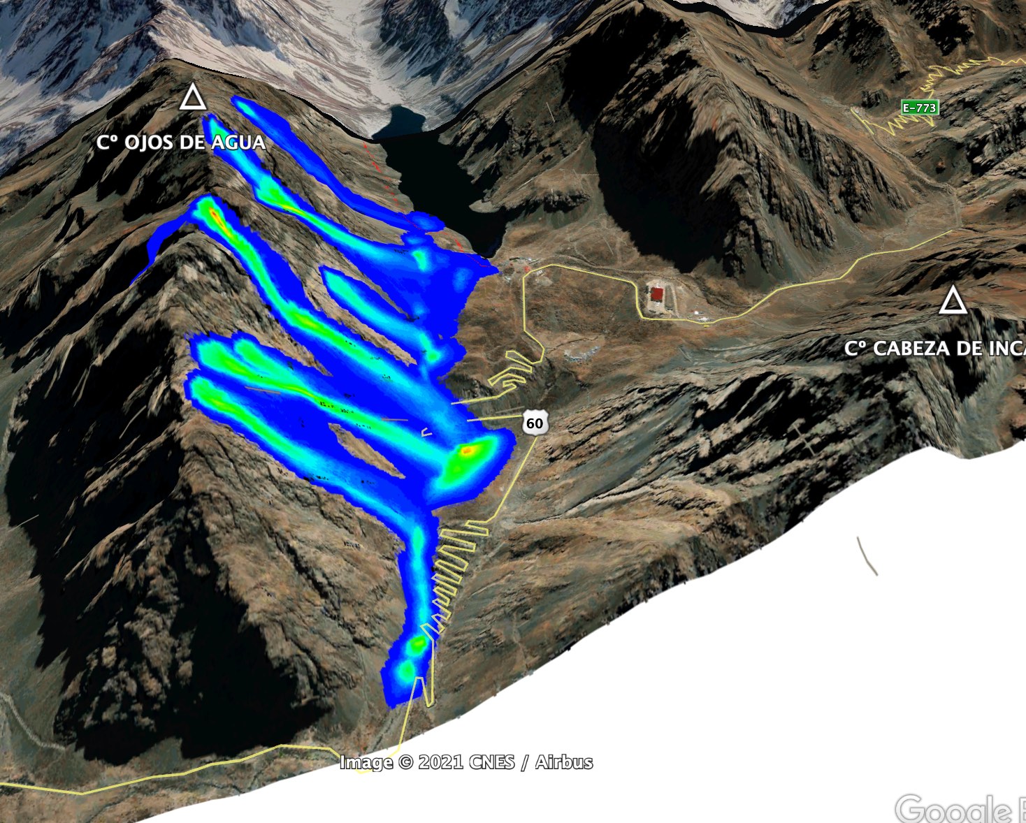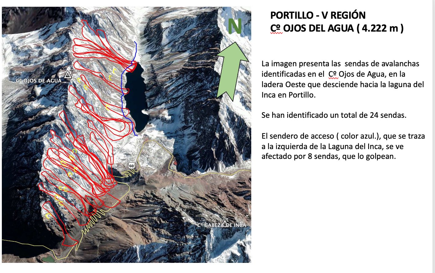 La imagen nº1 presenta la simulación de avalanchas, con altura del flujo en m, y la nº2, muestra toda la ladera Oeste del Cº Ojos de Agua, con sus 24 sendas, ubicadas entre la Laguna del Inca y la ruta desde Caracoles.