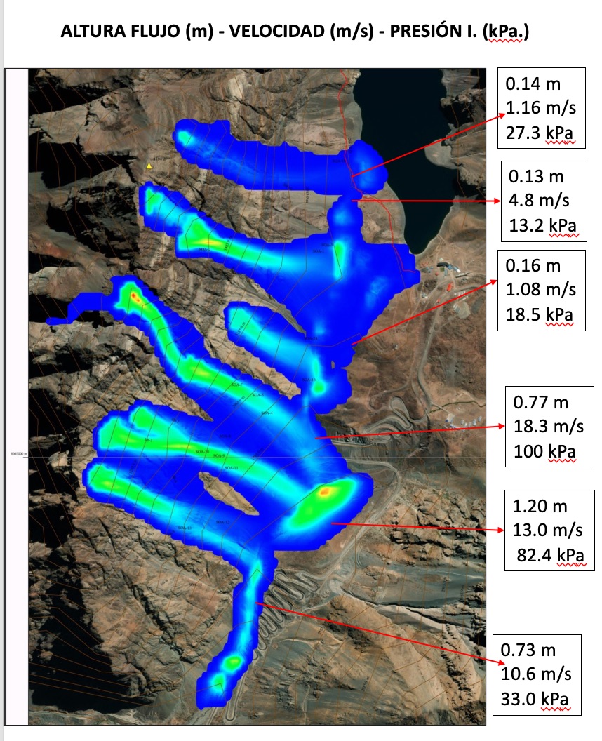 El siguiente mapa muestra la simulación de las sendas ( Cº Ojos Agua - Portillo.), ladera Oeste, con sus curvas de nivel y los limites del flujo. La siguiente imagen, nos muestra los resultados de la dinámica de avalanchas, con altura de flujo ( m ) y un T100 y profundidad de nieve desde 1.40 m a 2.0 m en zona de inicio. Se visualiza como las avalanchas golpean el sendero en color rojo y varios tramos de la carretera. Más abajo podemos visualizar como oscilaron las alturas de flujo ( m ), desde 0.14 m a 1.20 m, velcocidades desde 18.0 m/s a 1.08 m/s, y por último las presiones de impacto desde 18.5 kPa a 100 kPa.