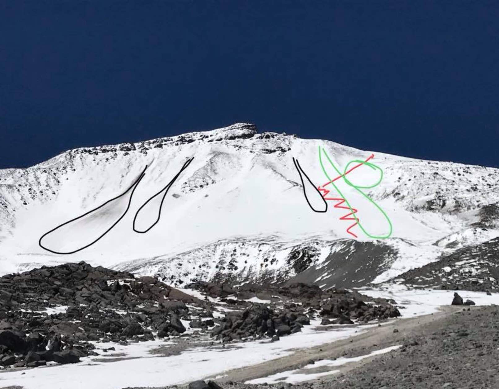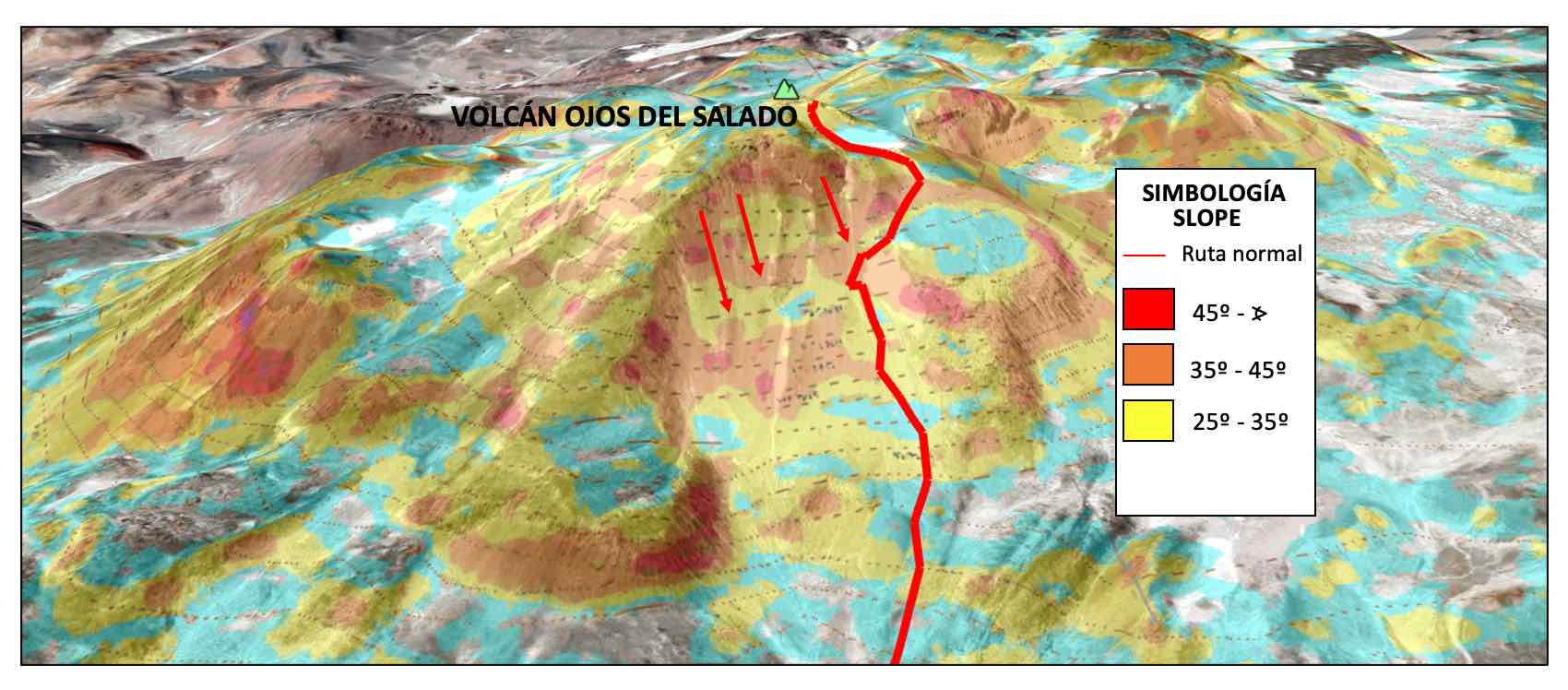 Mapa de pendientes, la ruta de ascenso en color rojo, pasa por zonas con pendientes entre 25º y 45º o más. Y se puede visualizar que las avalanchas ocurridas, pasaron por la ruta de ascenso.