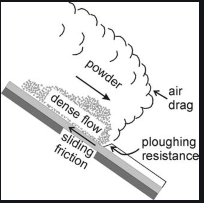 El tipo de aerosol y/o de nieve polvo, significa que existe una porción del fluído que tiene turbulencia de la nieve, que se moviliza en suspensión, por encima de 30 m, la presión es muy pequeña ( la densidad es a menudo <5 kg / m3 y la altura puede alcanzar > 200 m para una gran avalancha. ) y con saltación ( 4 m a 8 m), lo que genera una corriente de turbidez, es decir a varios metros del nivel del suelo, donde existe también la incorporación de aire al flujo, el cual actúa como aire que ingresa al flujo y el reflujo de aire que comprime el flujo y hace que la nube de polvo aumente, además, existe una interacción entre las distintas capas de flujo, lo que se traduce en un intercamabio de partículas, que aumentan su aceleración, logrando una disminución del tamaño molecular de los granos de nieve y una disminución de la densidad de nieve; y la avalancha se compone de otra porción de flujo más denso, que se moviliza como un flujo de mayor densidad, la cual va a nivel de suelo. Por otra parte, el flujo denso es la capa más profunda de la avalancha, con una densidad alta, a menudo alrededor de 300 kg/m3, la altura del flujo a menudo es de 0,5 - 4 m (dependiendo del tamaño y también del terreno, en quebradas también más altas.)