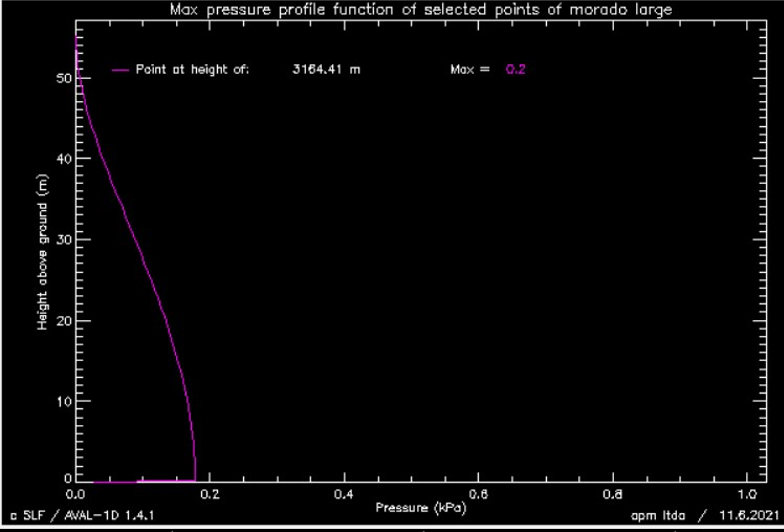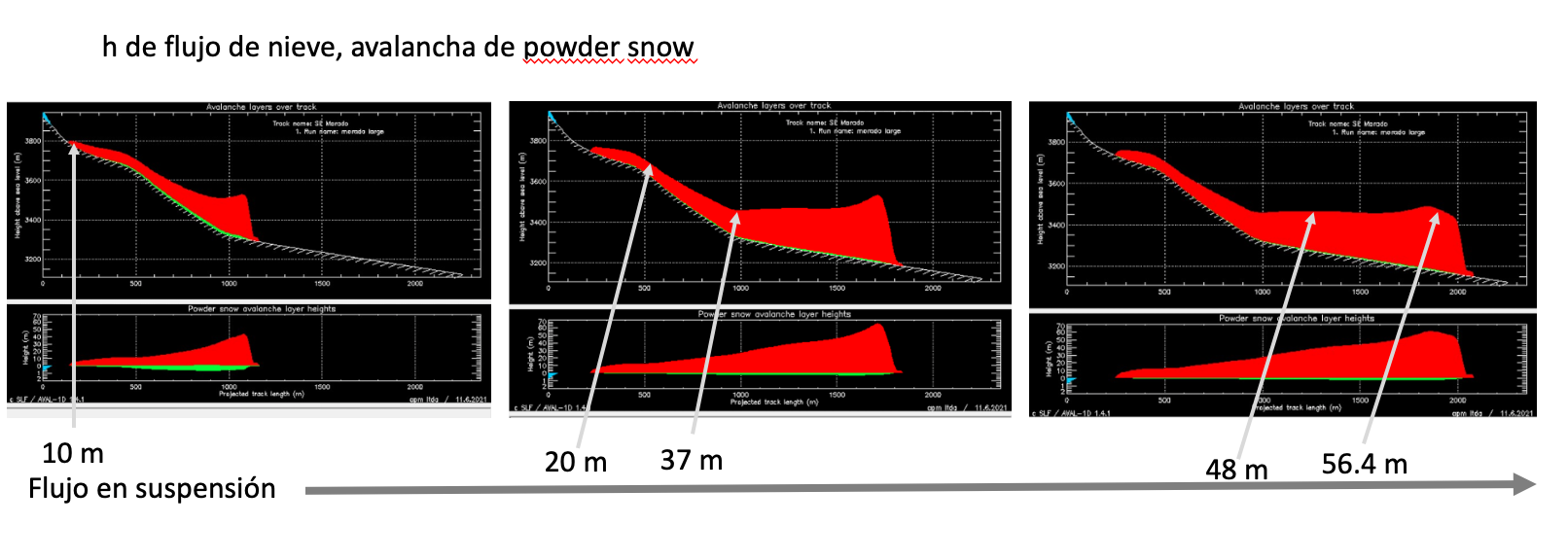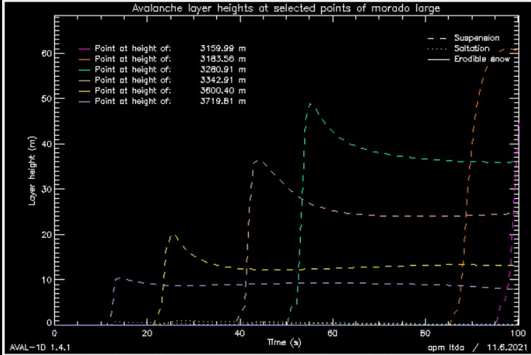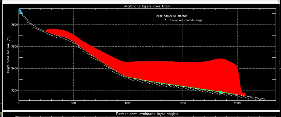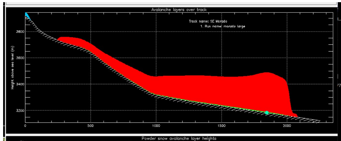 El siguiente gráfico muestra una avalancha de aerosol, modelada del glaciar sur del Morado, y el sector es el mismo, donde relatamos la avalancha de serac, que afectó a Juan José Bustos y Caro Toro.