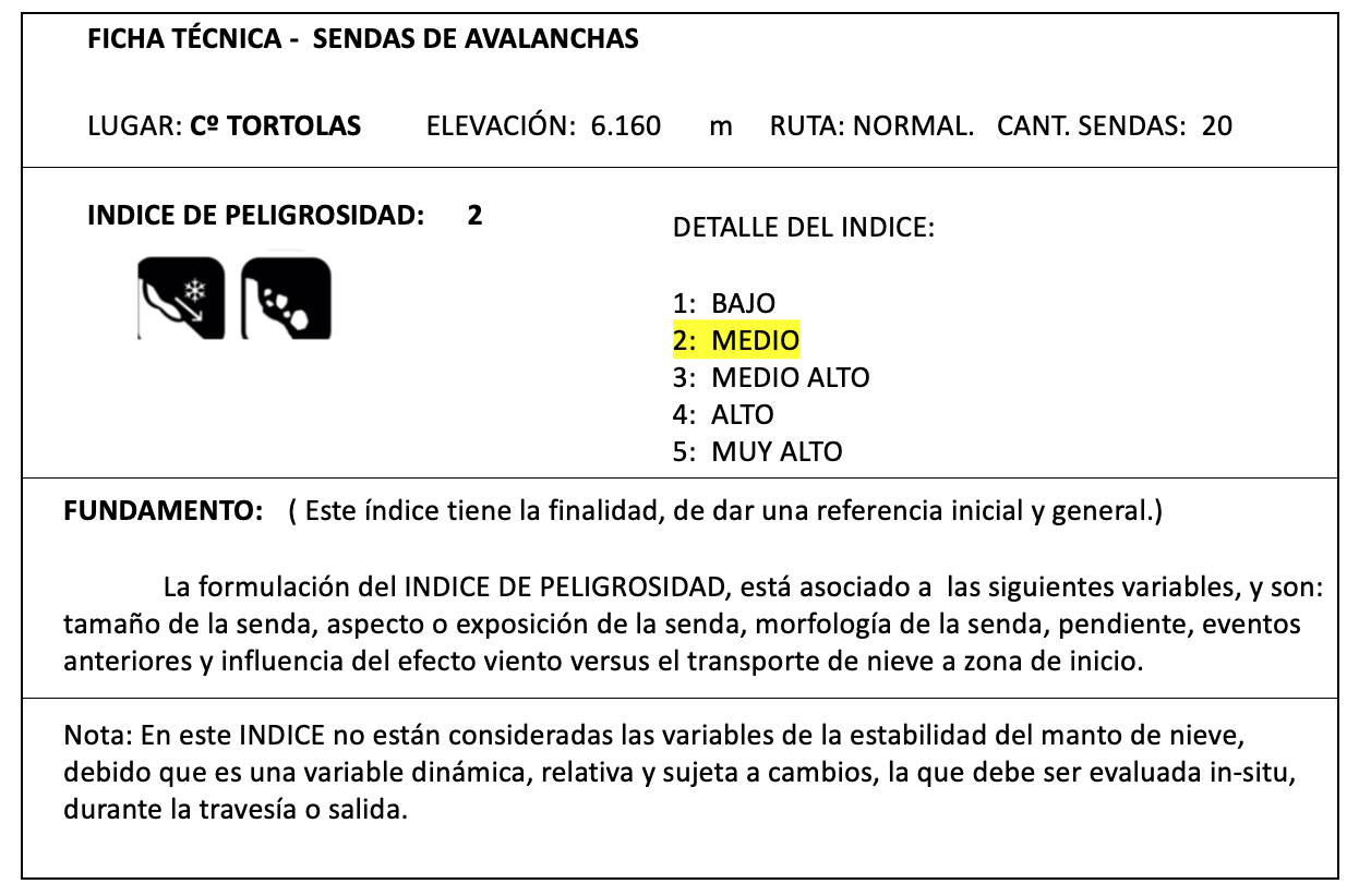Hemos formulado un INDICE DE PELIGROSIDAD, para que el usuario disponga de un parámetro o visión inicial del sector o cerro; y así pueda conocer o disponer de información en forma previa el área a visitar. Por otra parte, este INDICE ha considerado algunos parámetros fijos y sólo un parámetro variable, que es el efecto del viento.