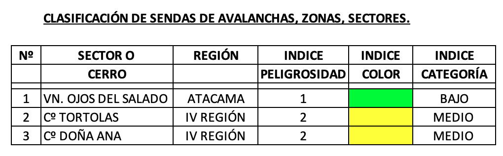 RESUMEN DE CLASIFICACIÓN DE SENDAS Y/O SECTORES DE AVALANCHAS. ( INDICE MACRO.)