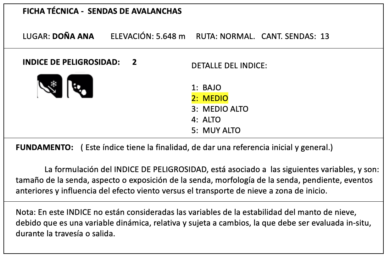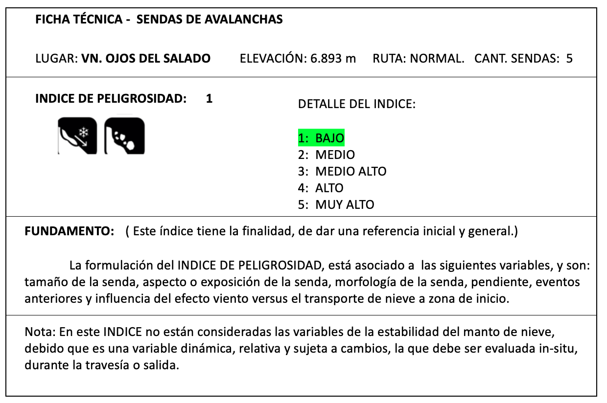 Hemos formulado un INDICE DE PELIGROSIDAD, para que el usuario disponga de un parámetro o visión inicial del sector o cerro; y así pueda conocer o disponer de información en forma previa el área a visitar. Por otra parte, este INDICE ha considerado algunos parámetros fijos y sólo un parámetro variable, que es el efecto del viento.