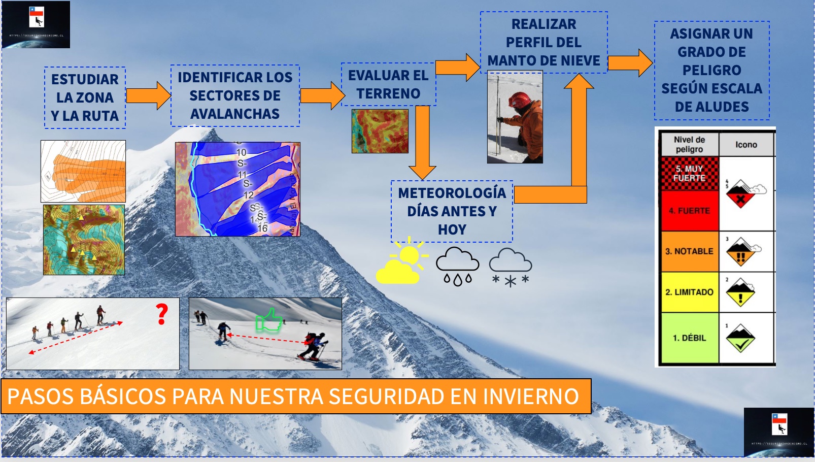 El siguiente esquema conceptual, presenta los puntos fundamentales, para la "evaluación del peligro de aludes" y optimizar la seguridad en nuestras travesías. Hemos considerado los aspectos básicos, para que un grupo de personas, se desplacen en forma segura, bajo condiciones invernales, en zonas nevadas y donde se pueden generar avalanchas.