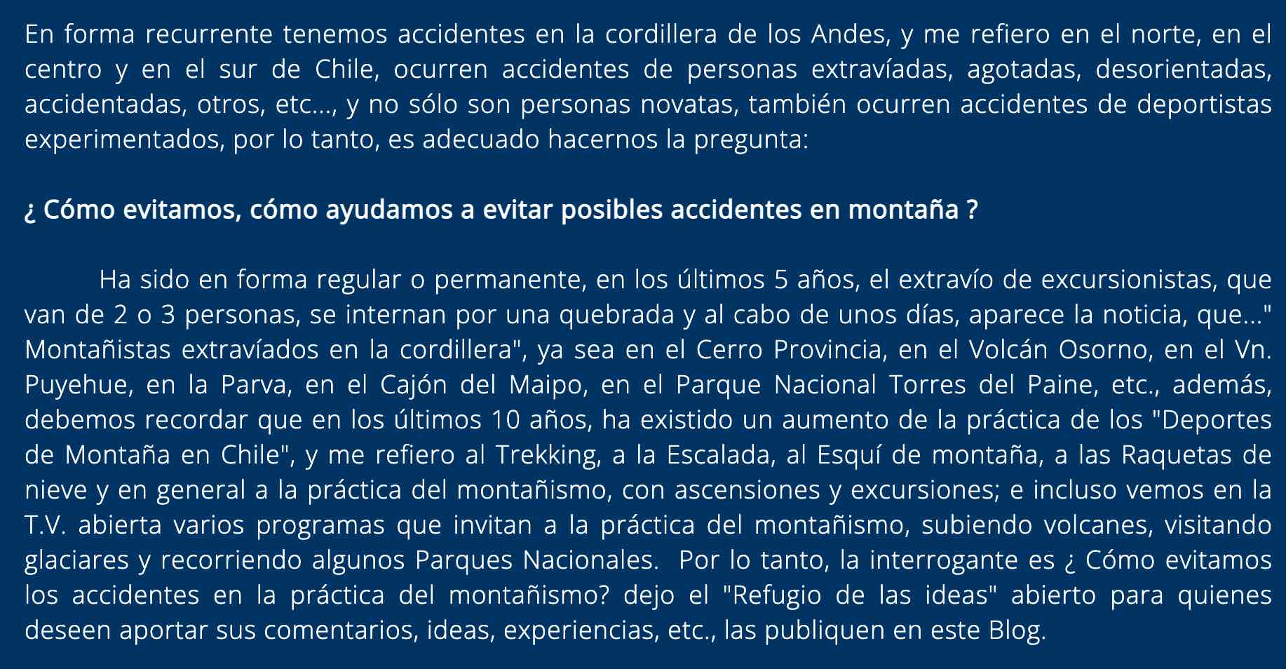 IMPORTANTE: "LOS ACCIDENTES NO OCURREN PORQUE SI, O POR UNA MALA SUERTE", después de realizar muchos estudios, análisis y revisión de los informes de accidentes e incidentes, a las causas raíz de los accidentes en montaña, especialistas de Europa y US.A., se concluye: