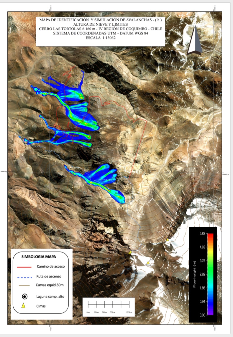 El siguiente mapa de avalanchas, corresponde a la ladera Oeste; se han simulado las avalanchas, y se visualiza sus limites, como zona de liberación + trayecto + depósito. ( h de nieve.)