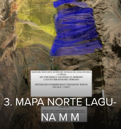 Por otra parte, se puede visualizar como el flujo de nieve, de la ladera Oeste, alcanza a golpear el sector del campamento, ubicado en la laguna del Mirador del Morado,