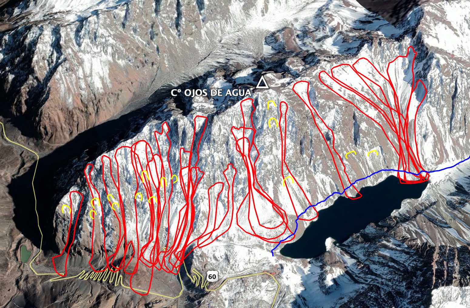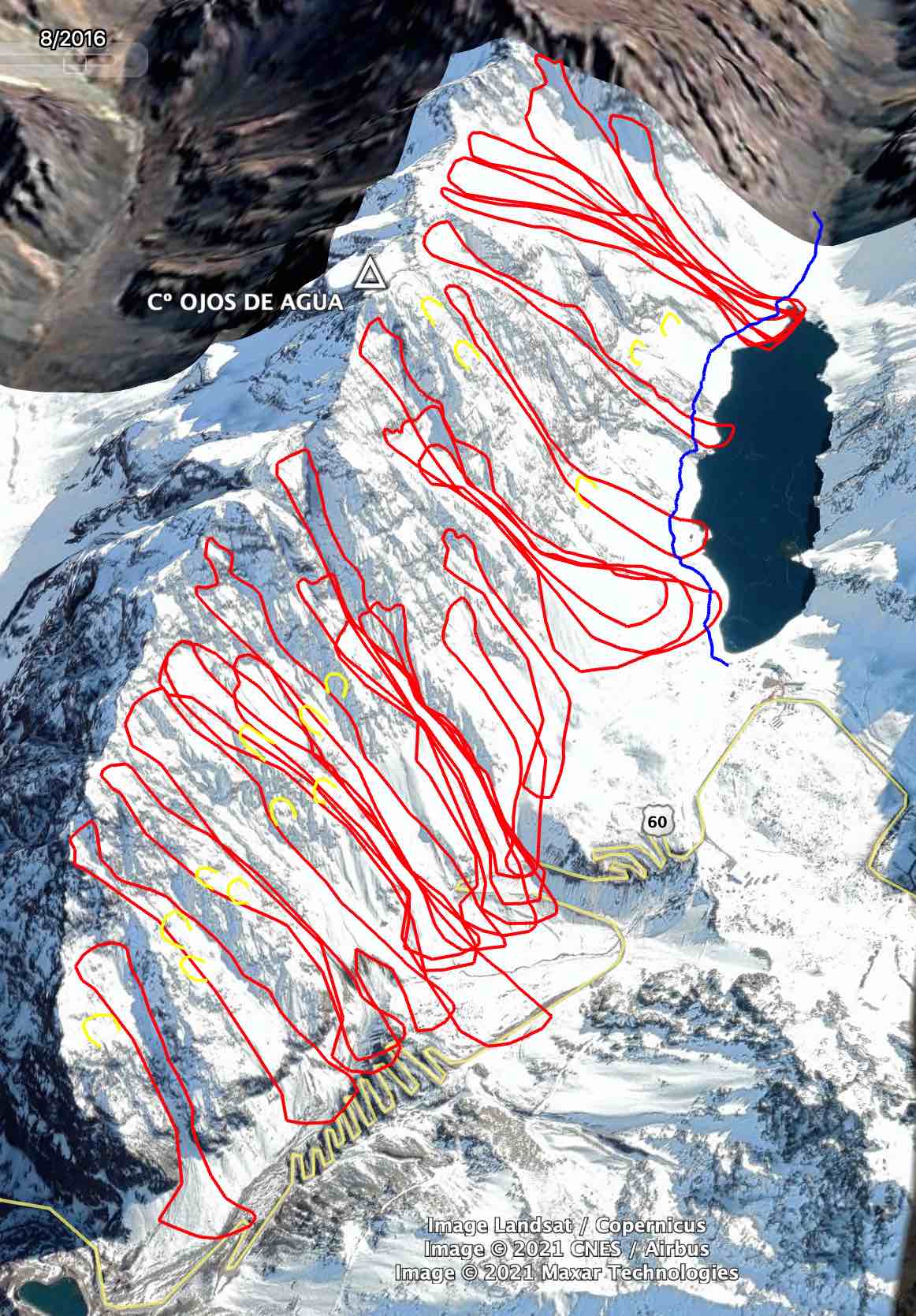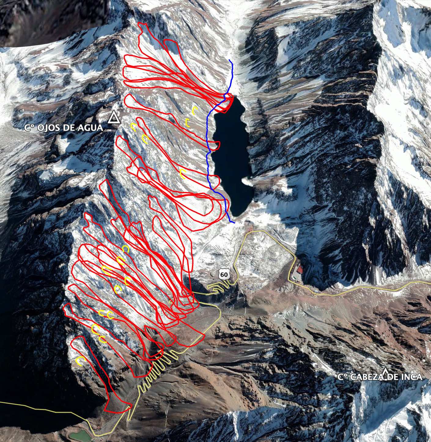 Las siguientes imágenes en 3D, descargadas de Google Earth Pro ( 17/07/021.); indican con las capas sobrepuestas de color rojo, los limites y alturas de flujo ( m ) de las sendas de avalanchas, de la ladera Oeste del Cº Ojos de Agua, ubicada en Portillo V región.