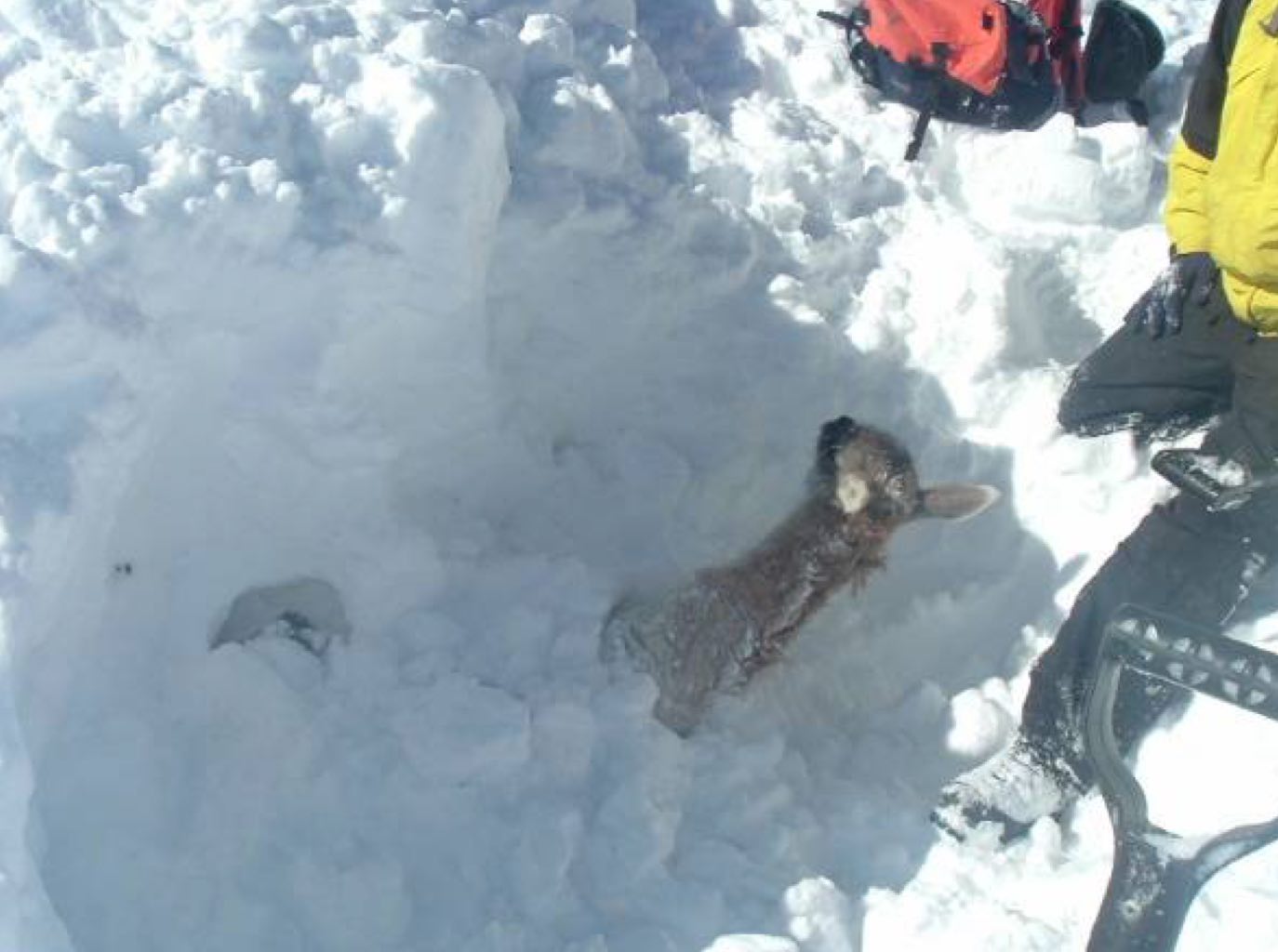 Estimamos que el Guanaco pesaba alrededor de 80 kgs., y al descender por la arista, sobre la senda de avalancha, este animal comenzó a saltar, sobre la nieve, ya que se estaba enterrando en la nieve onda; con dicha acción generó una sobrecarga del manto de nieve, lo que ayudo al colapso + una fractura que se propagó varias decenas de metros, en forma perpendicular al flujo de la senda.