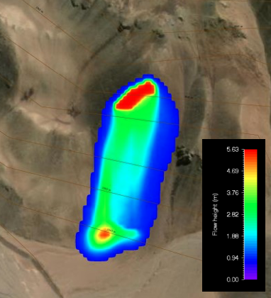 Simulación de senda de avalancha, altura ( h ) de flujo de nieve.