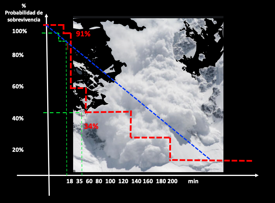 El gráfico muestra la probabilidad de sobrevivencia, de una persona debajo de la nieve o sepultada bajo la avalancha; será clave la "HORA DORADA" o los primeros minutos, fundamental para rescatar con vida a la víctima. Disponemos de los primeros 15 min. para encontrar a la (as.) personas, luego cavar, y sacar a la víctima + los primeros auxilios, RCP si aplica, etc.