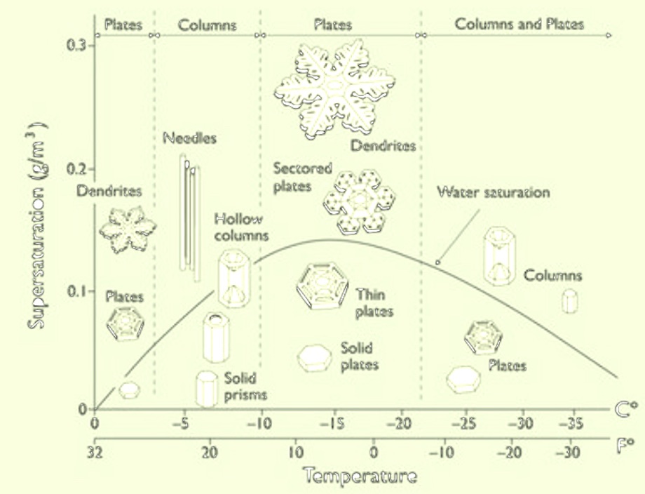 La nieve se genera en la nube, mediante diminutos núcleos de polvo y gotas de agua, producto del vapor de agua, se unen y se congelan, con esta unión rápida se forman los cristales de nieve, estos tienen tienen una simetría hexagonal, es decir 6 lados iguales, esta simetría se logra, debido que en las moléculas de agua, existen 2 átomos de hidrógenos, que están separados 120º, igual como los lados de un hexágono, en la medida que los cristales caen desde la nube, se van agregando nuevas partículas de agua, las que van dando forma al cristal de nieve, con distintas geometrías, las cuales varían dependiendo de la temperatura y la humedad.