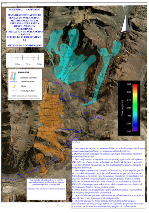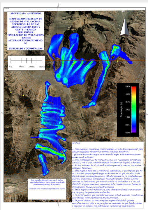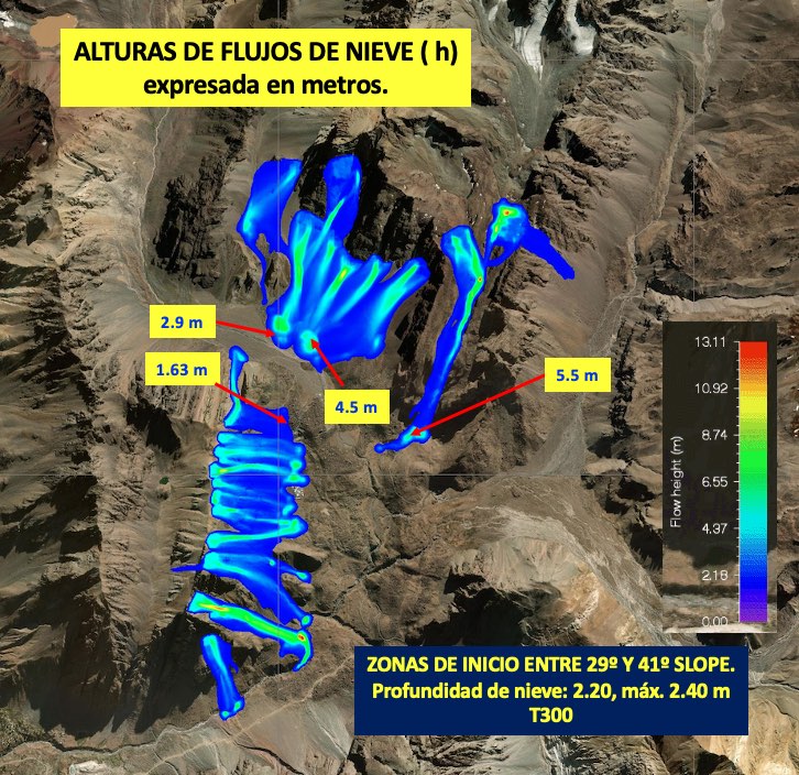 El siguiente mapa ( 2. MAPA SIMULACIÓN I. - V. ARENAS.), grafica la simulación de avalanchas y calculo numerico, de las alturas de flujo ( h ) de nieve, expresada en metros. Y podemos observar como la mayoría de las avalanchas golpean el camino; y nos referimos a avalanchas del tipo flujo denso, ya que si consideramos avalanchas de aerosol, estas deberían tener un mayor alcance hacia el fondo de valle.