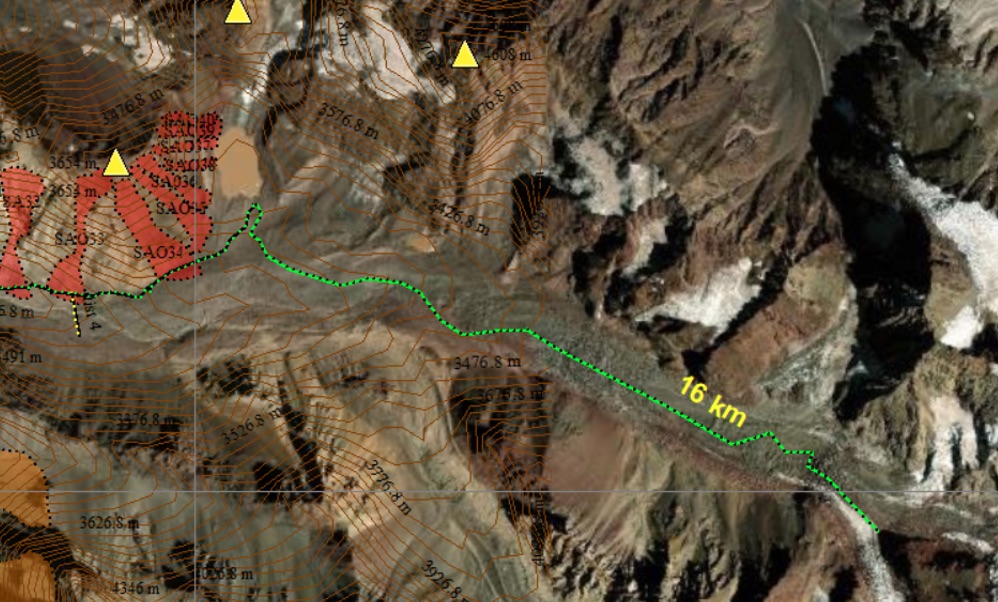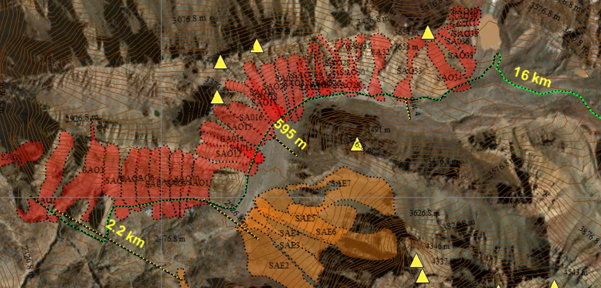 Este mapa muestra el modelamiento de las avalanchas, en el sector de inicio e ingreso al Valle de las Arenas.