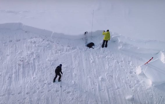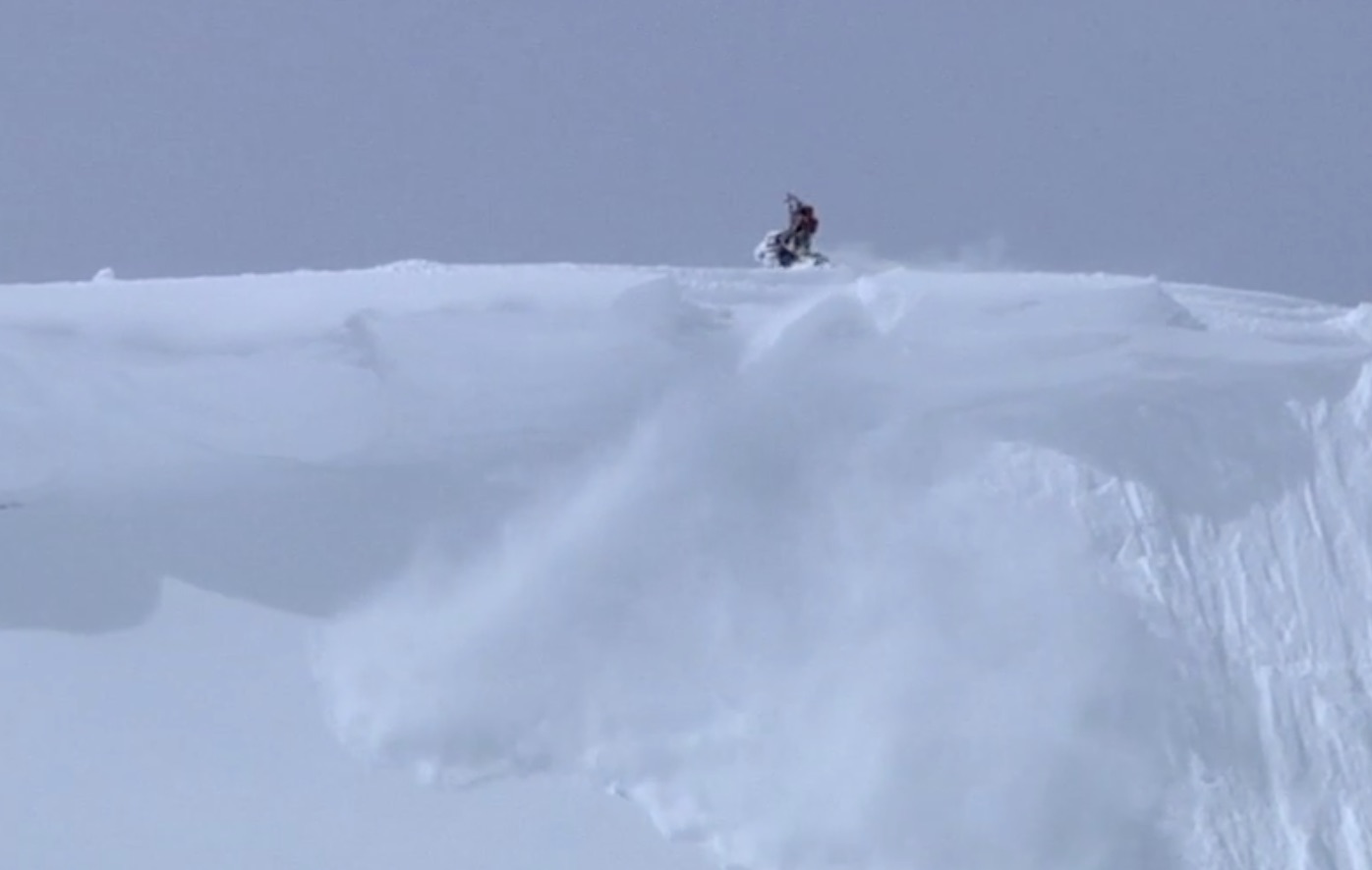 La imagen arriba, muestra la moto de nieve, como bota cornisas, es decir, con esta fotografía se puede captar el efecto de la sobrecarga, los expertos recomiendan no ejecutar dichas maniobras y/o No recomendado. ( Fuente: Moto de nieve L1., American Avalanche Institute.)